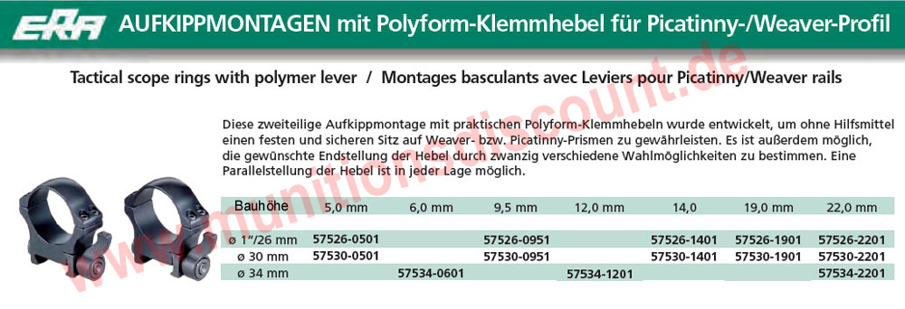 | Bezeichnung: | ERA AUFKIPPMONTAGEN mit Polyform-Klemmhebel für Picatinny-/Weaver-Profil, für Durchmesser 1 Zoll/26mm, Bauhöhe 22mm | |||